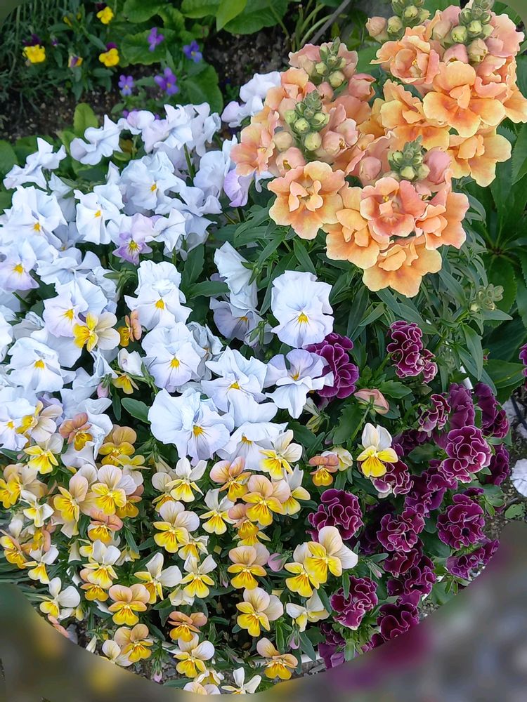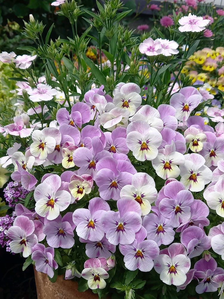 ②③ビオラおかめももか、徒長してるけど良く咲いてます🤗ダイアンサスがやっと咲き始めてます🥰