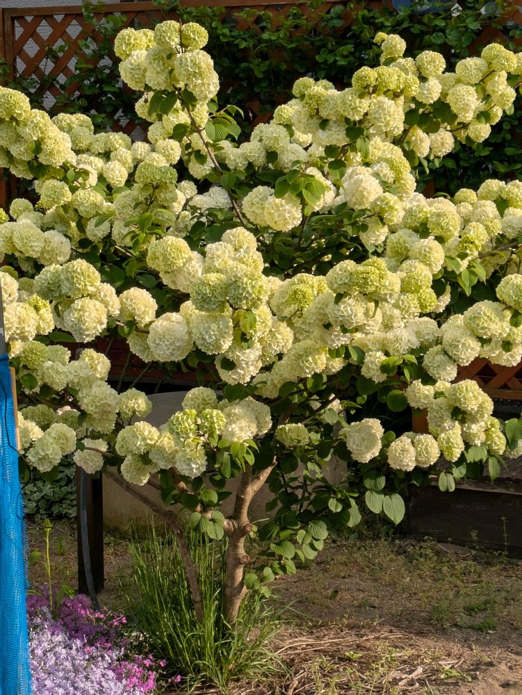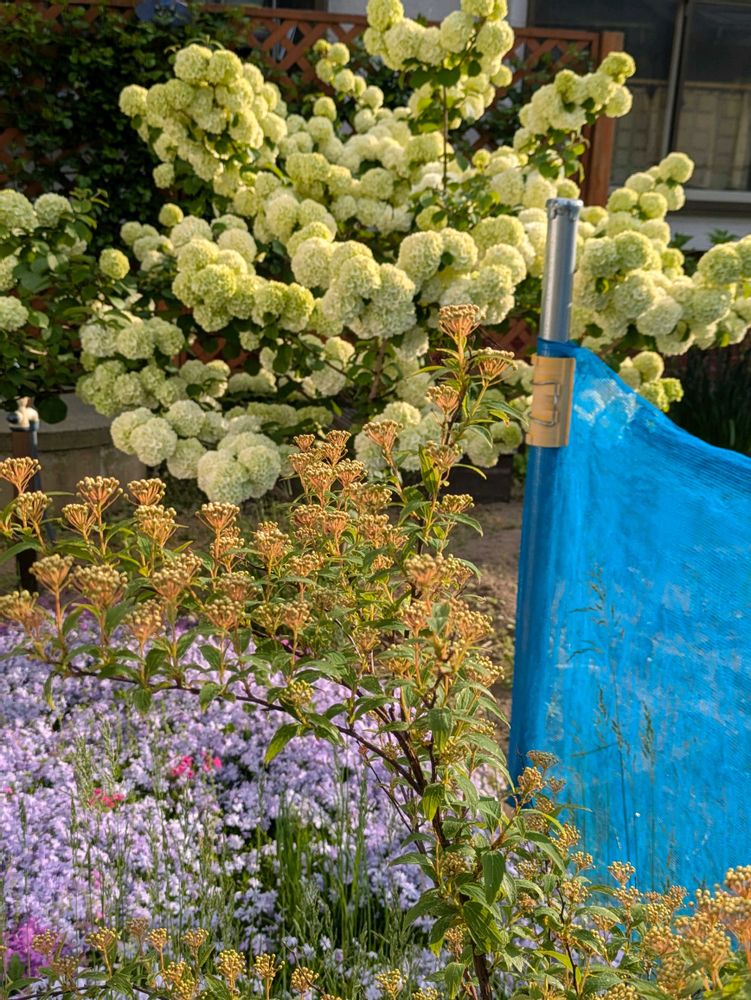 オオデマリの手前は芝桜と芍薬、鉢植えのコデマリ。ちゅうでまりとかあるのかな⁉️