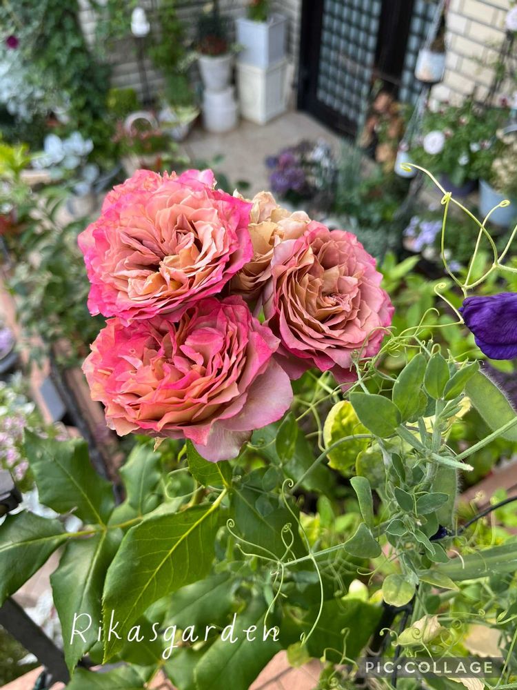 ①今日は暑くなり、色んなバラが開いてしまいました。もっとゆっくり咲いて欲しいのに‥