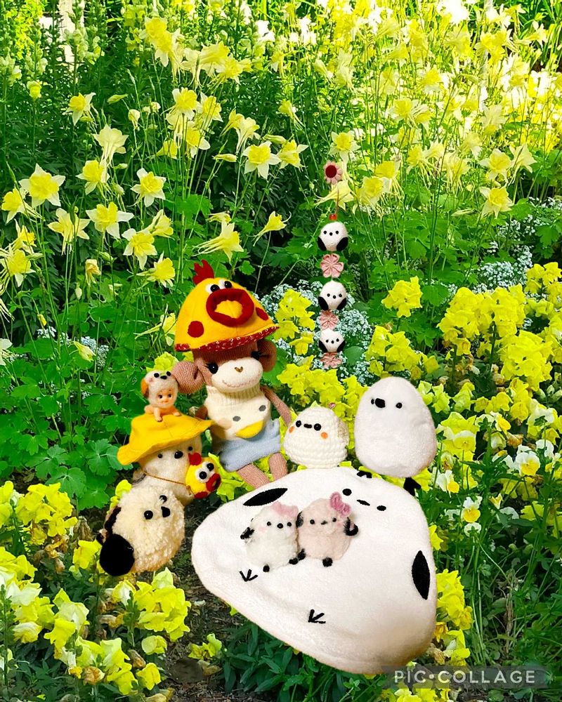 さん、キチンバッグもめっちゃ可愛いーー♥♥吊るし雛みたいになったコも可愛いしーーあみぐるみのコと、クッションみたいになってるコも気にかかるーー😋その上にいる2羽が何気に色が違うでしょ!?