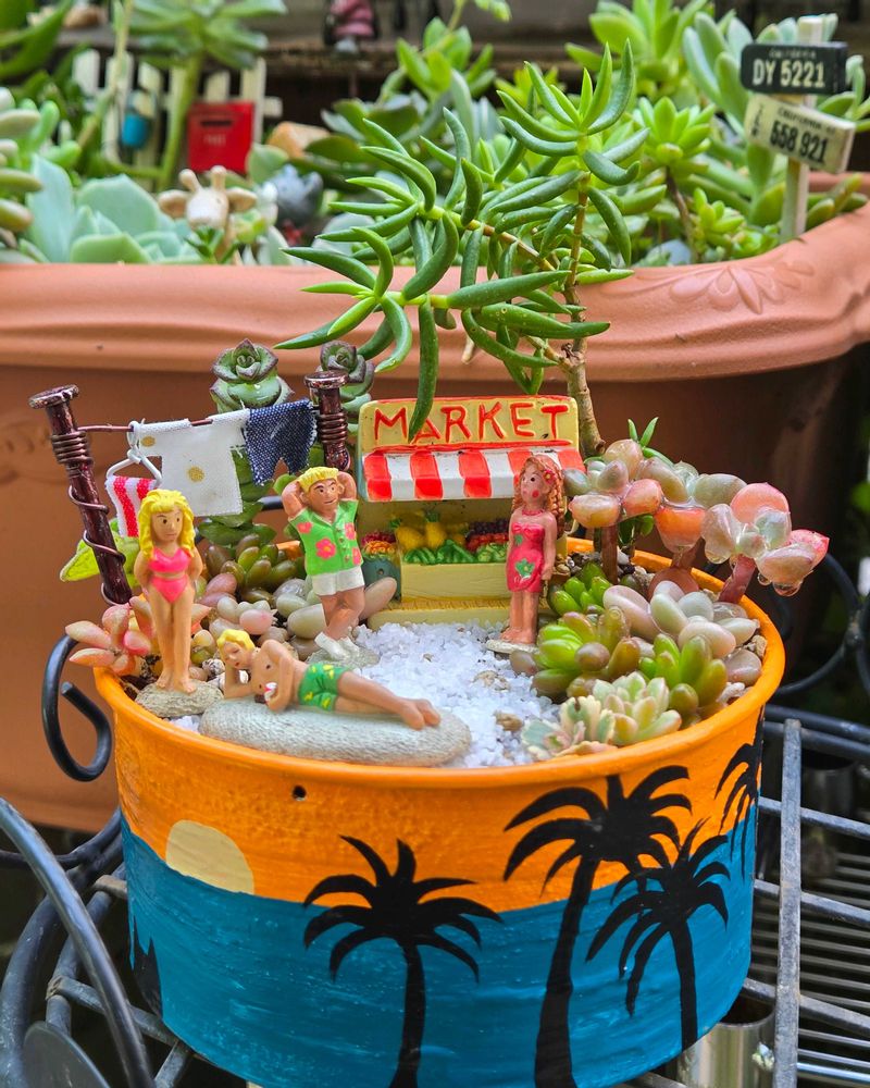 先日横浜高島屋でmiiwaさんのイベントあり一緒に出店されていた作家さんのアロハ🌴鉢と洗濯👕ピックとmiiwaさんの多肉セットと家の多肉ちゃんで夏のイメージで箱庭作ってみました🤭 お人形はかたずけてたら出てきた20年前?🙄のです🤭