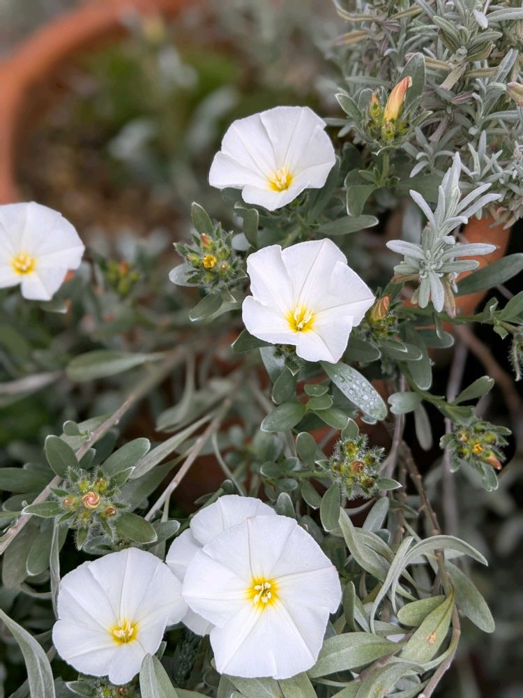 輝きを持つシルバーの葉と10cmほどの白花が独特の色彩でおしゃれなヒルガオ