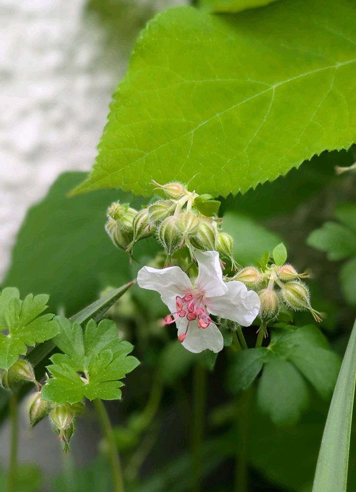 ①ゲラニウム・ビオコボがアナベルの葉影で一輪開花していました🎶