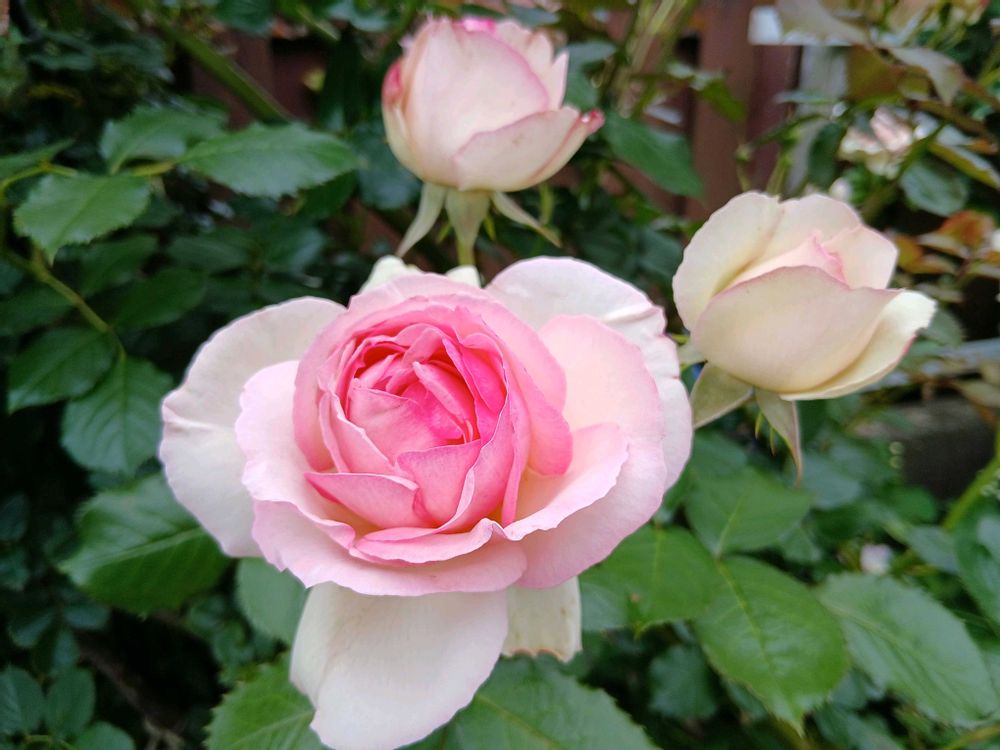 天使の誘惑と云う意味の名前をもってます。残念ながら主枝が1本になってしまいました。花びらが薄く雨には弱いですが、多弁でゴージャス。