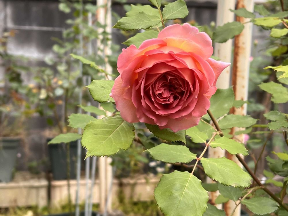 コーラルピンクに黄色味がかったような深味のあるお色のバラさんですネ🌹