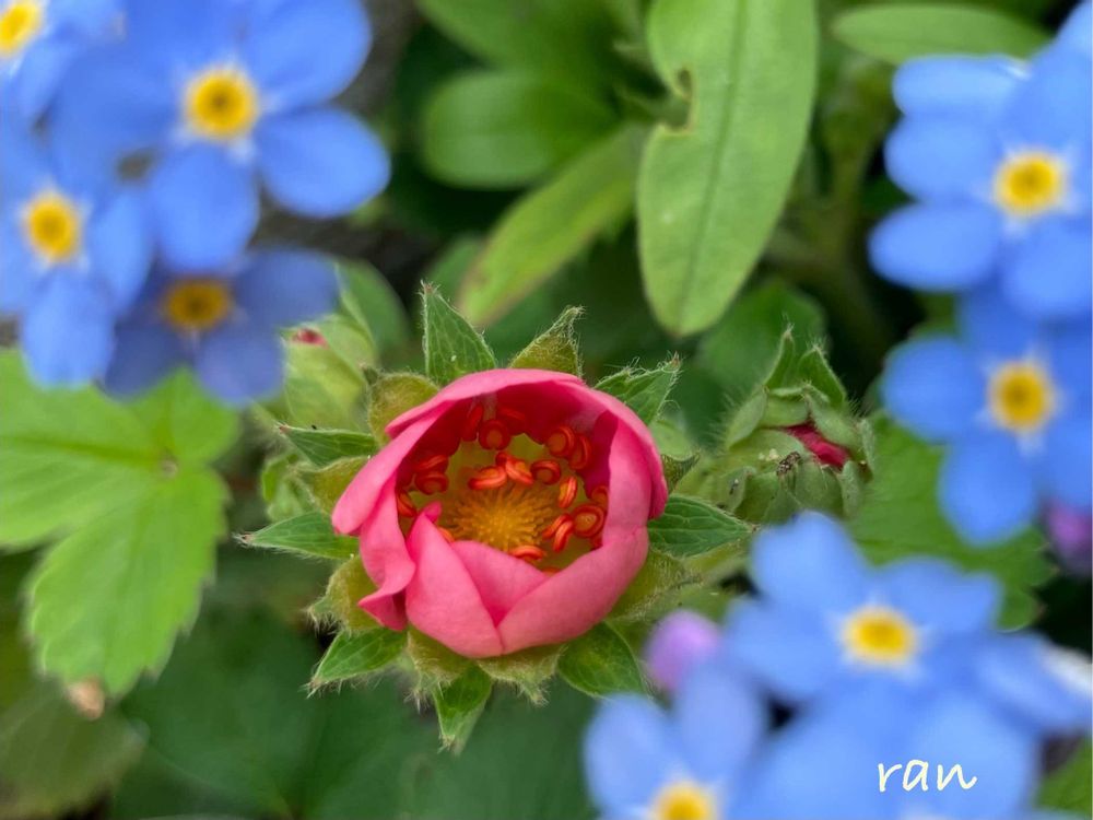 ピンクと青のお花が