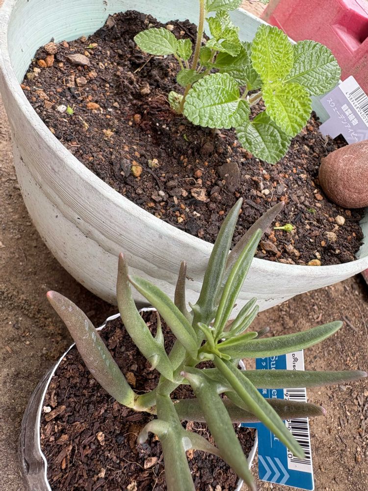 スウェーデンアイビーとカランコエ属って書いてあるけどカランコエはなんて名前なのかな??ただの花の土に植えてみたけど大丈夫かな🤔