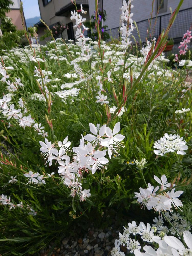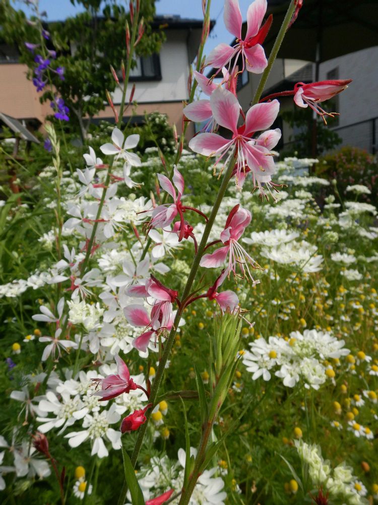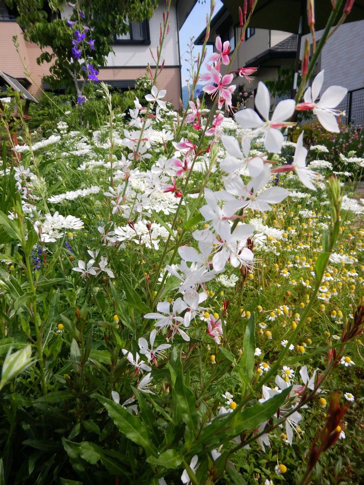 我が家の今日の庭です。ガウラがユラユラ揺れている。周りはオルレアホワイトレース、カモミール、チドリソウなど。
