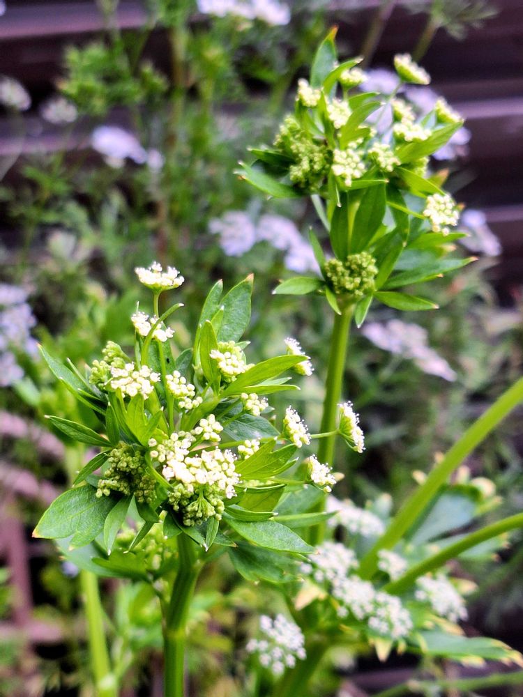 セロリの近くにパクチー、ミツバもあるけど花が似てるな~と思ったらみんなセリ科で仲間なのね🎵