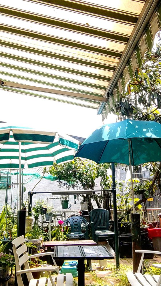 気温28℃、朝からパラソルのベースを西側から東側へ設置しました😣