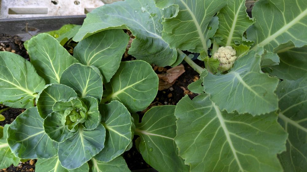 ムラサキキャベツは毎年大きめな鉢に彩りとして カリフラワーは今年初めてプランターに植えてみました。