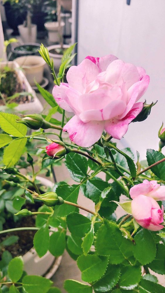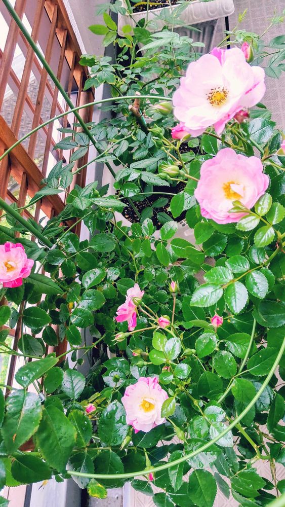 さんこんばんわ🌃 たくさん咲いてくれて ベランダが華やかです 横に広がって いくみたいで 慌てて 囲いました お庭だったらそのままにしときたい のですが これはこれで素敵でした🌹