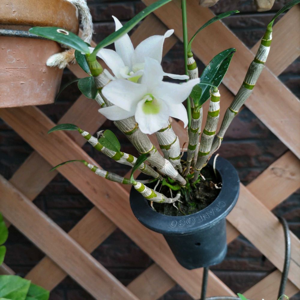 (地道投稿)先週の木曜日戻り、日陰で休ませた1️⃣「イワヤツデ タンチョウソウ」です。GS眺め真似👍角鉢に植え替えしました。無事に花も咲きました。2️⃣「デンドロビウム エンゼルベイビーグリーン」先月物置脇の鉄管遮光網庫に入れました。墓掃除準備中に開花を確認して投稿します。