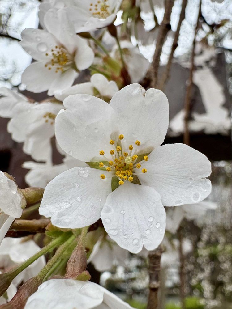 花は中輪、白色の一重咲きで枝垂れタイプのサクラです。