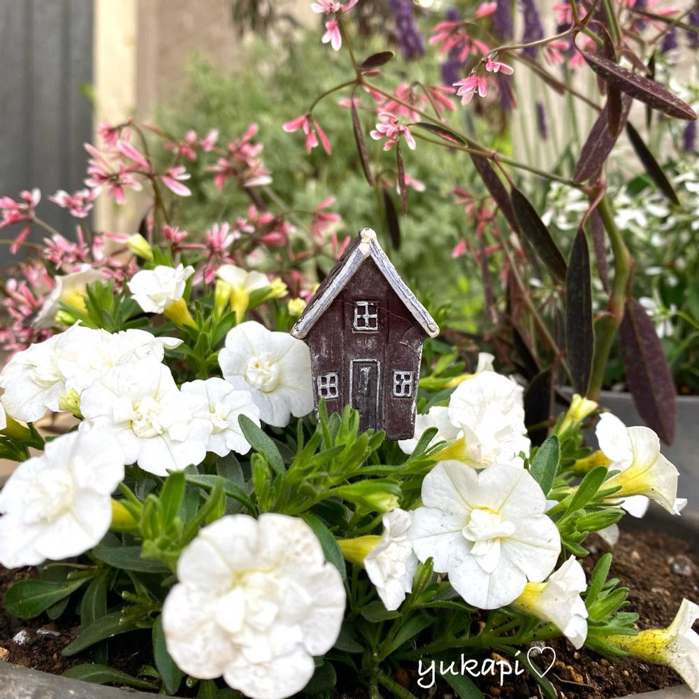 白のカリブラコア可愛い〜お家のまわりがお花畑🏡こんなお家に住みたくなります🏡🤍ピンクもあるの〜もうゆかぴさん♪可愛いすぎます😍