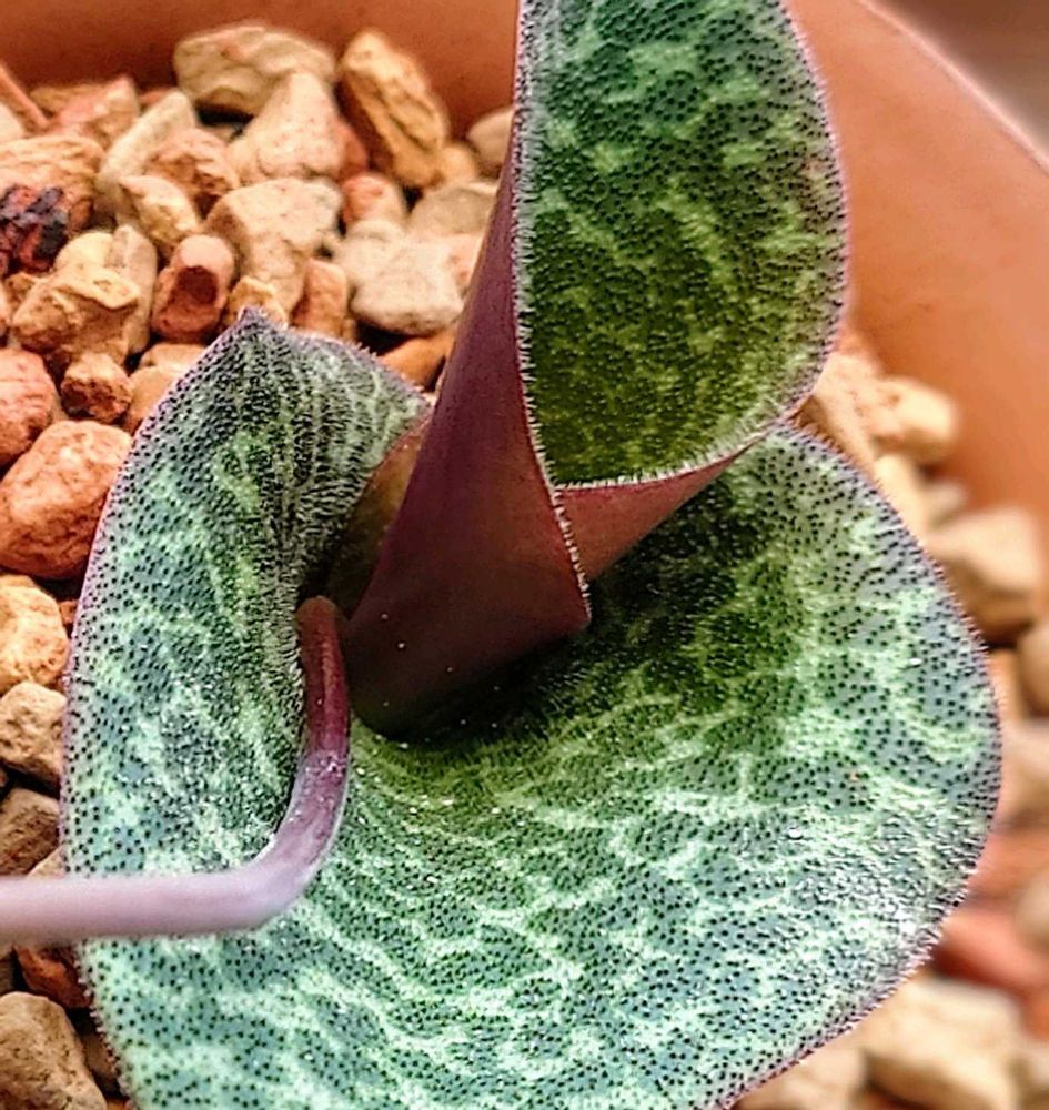 葉の表面は微毛びっしりザラザラ緑肌ランダムスポット入り