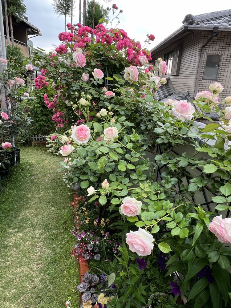 お庭の「アンジェラ」🌹さん満開です。アーチの反対側はピエールさんです。