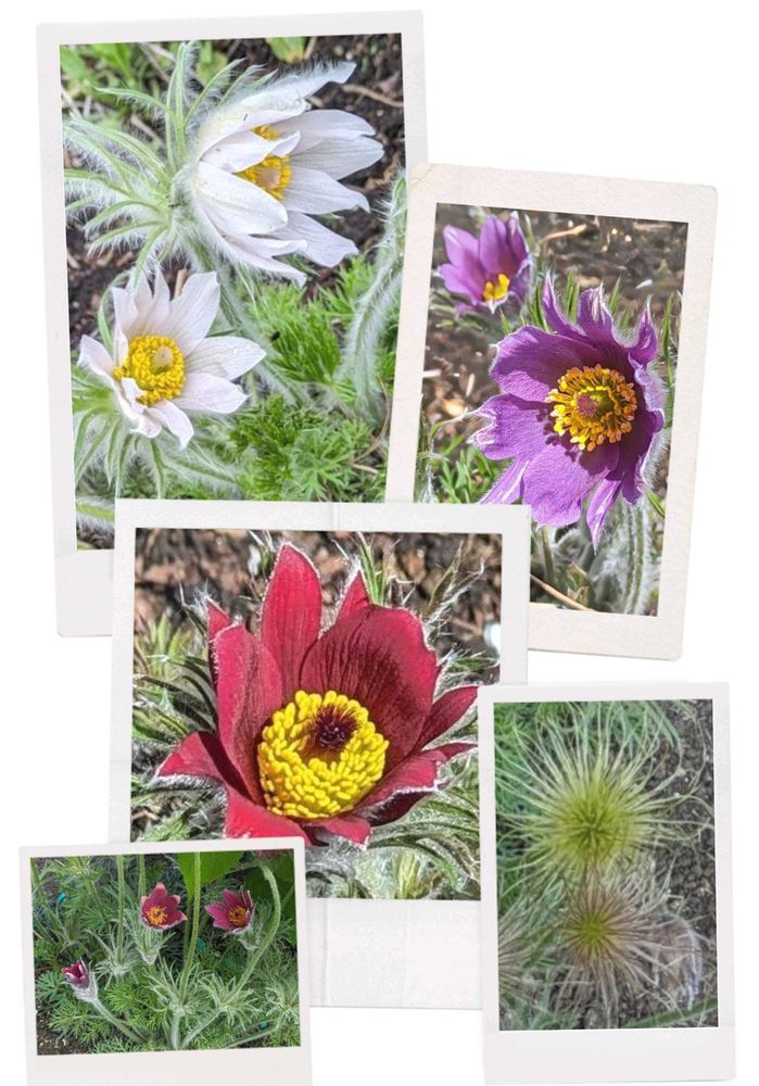 今日のお花の翁草、黄色が未だ咲かず🌿🤍💜❤️がもうすぐ綿毛になりそうよ♬🤗