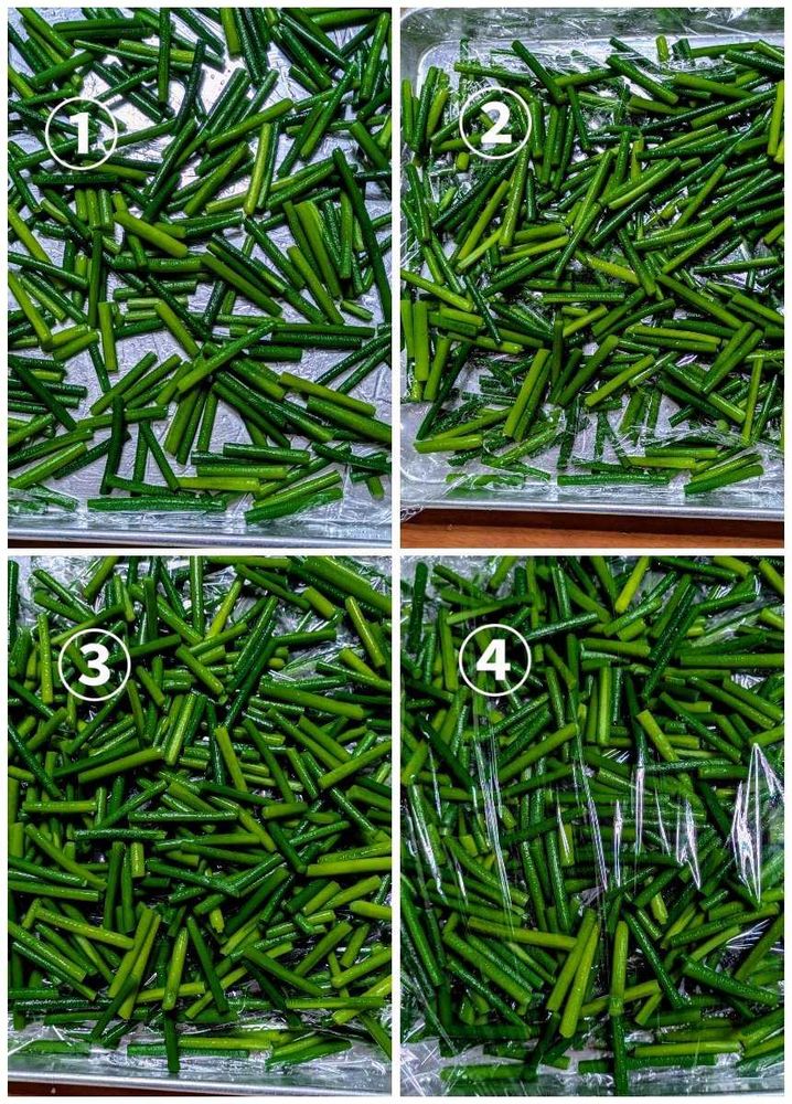 茹でてカットした芽を金属製のバットに重ならないように薄く広げて、ラップをしてまた薄く広げるを何度か繰り返し、最後にラップを数枚重ねて貼り付け冷凍する。