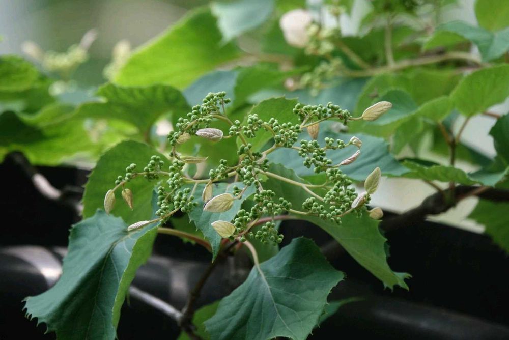 葉はツルアジサイは広卵形で細かな鋸歯があり、イワガラミは縦に細長いハート形で鋸歯が粗い。