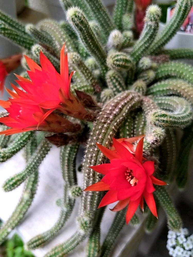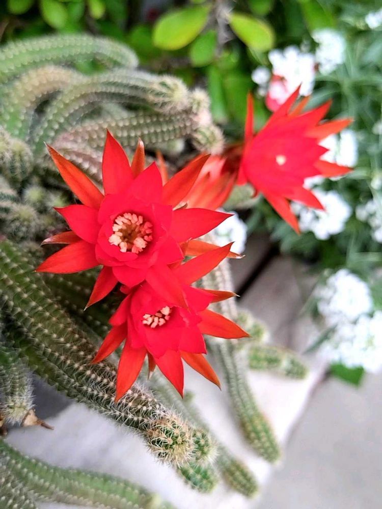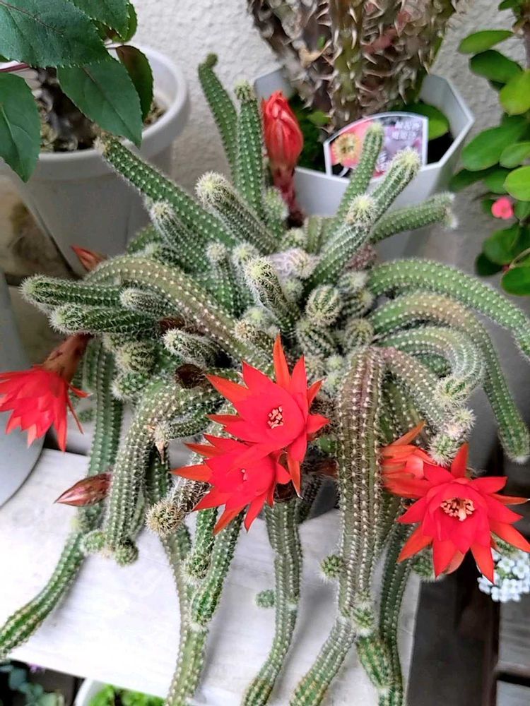 白檀たくさん咲きましたヽ(=´▽`=)ノ❤️真っ赤なお花が存在感あります😍ゆみこさんのニョロニョロサボテン🌵上手く伸びるといいですね😆