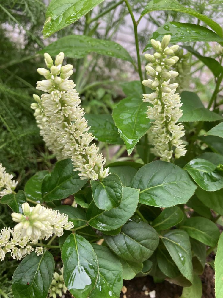 普通の?コバノズイナは花房が枝垂れる感じですが(その姿も好きですが)、この品種はニョキっと上向きで面白い。まだ小さいので白いアジュガやベロニカのようです。