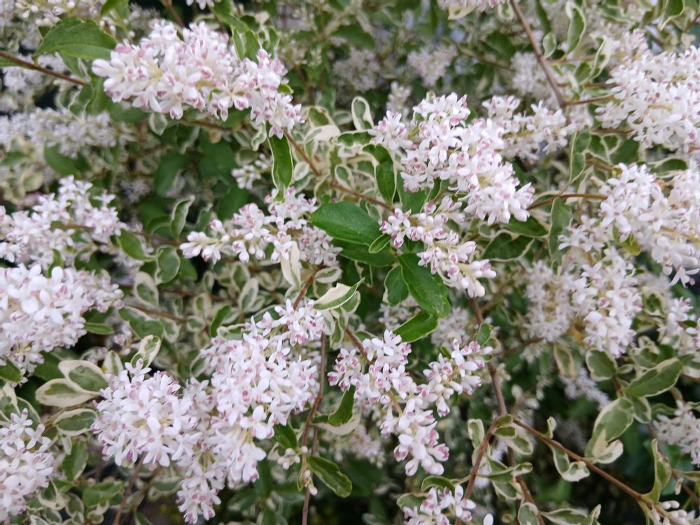 シルバープリペットの白花と斑入りの葉が涼やかです。
