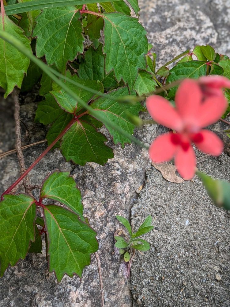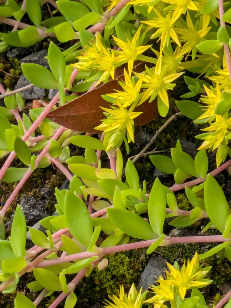 ⑤ツルマンネングサ ベンケイソウ科 マンネングサ属 駐車場へ向かうエントランスの壁の隙間から延び、蔓を這わせて増殖中