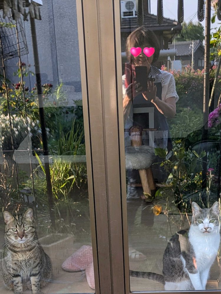 私は毎朝掃き出しの窓から出て携帯片手に庭パトを始めます おふたり🐱🐱揃って