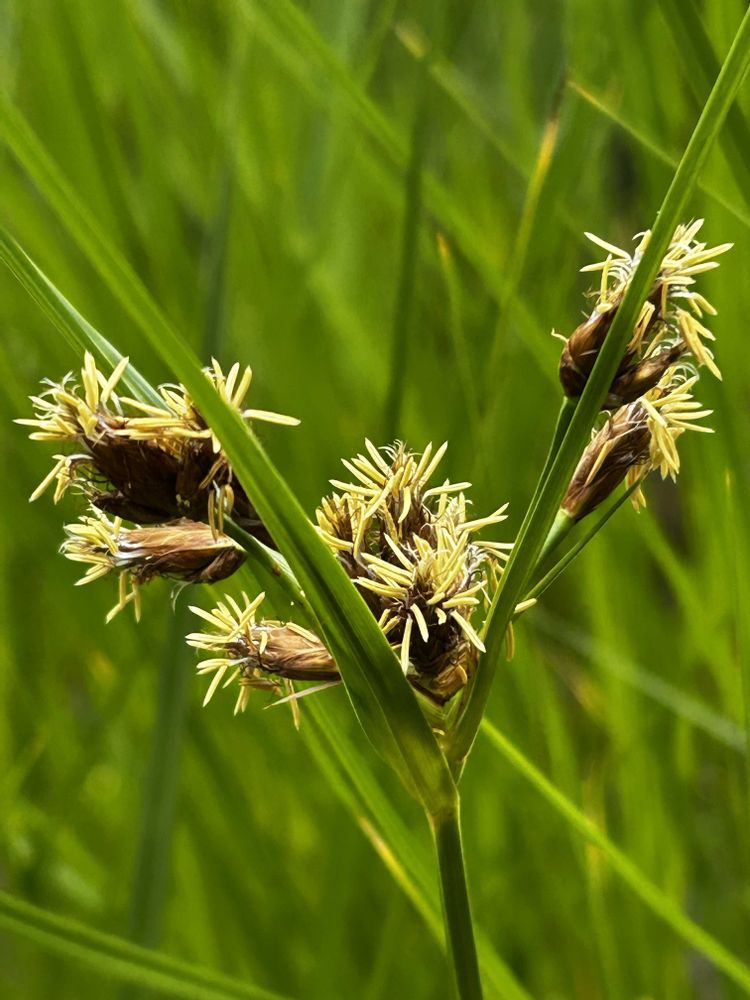濃い緑の細長い葉(総苞)が放射状に広がり、総苞の脇から長楕円形の手のひらのような小穂が垂れ下がり、淡褐色の花が咲きます