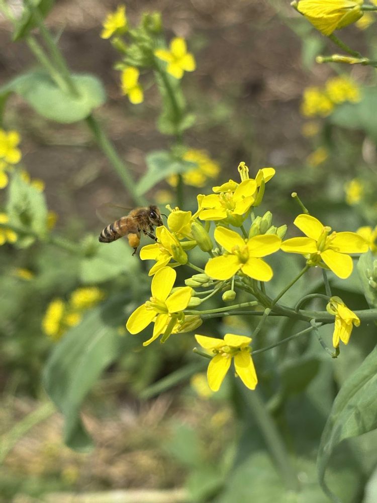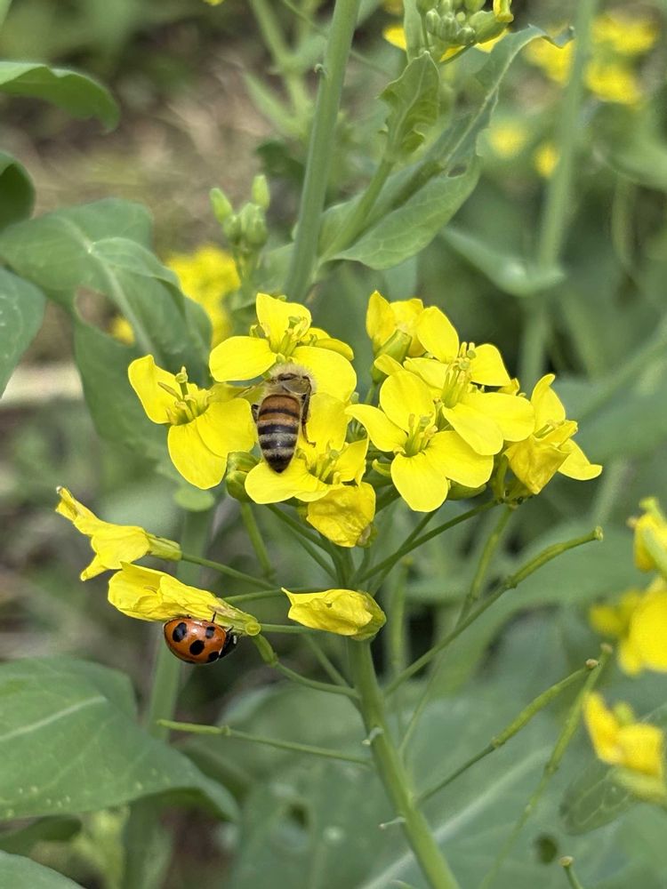 夫情報により昼から家庭菜園に行ってみると、タチアオイが見守る中、蜂やテントウムシやモンシロチョウが、賑やかすぎるくらい賑やかに活動していた😵😵😵〜ワォ❣️