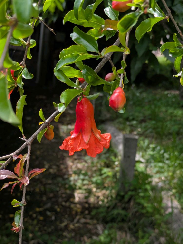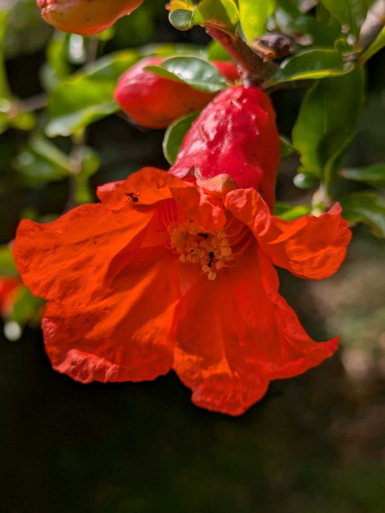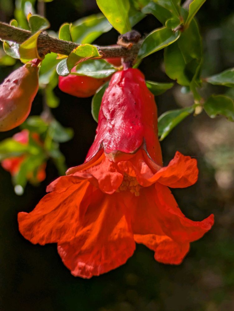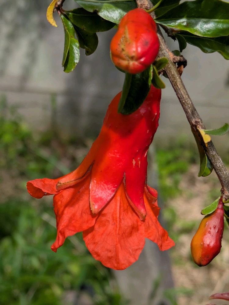 タコさんウインナーから出てきた薄紙のような緋色の花弁、ザクロの花が咲き出しました