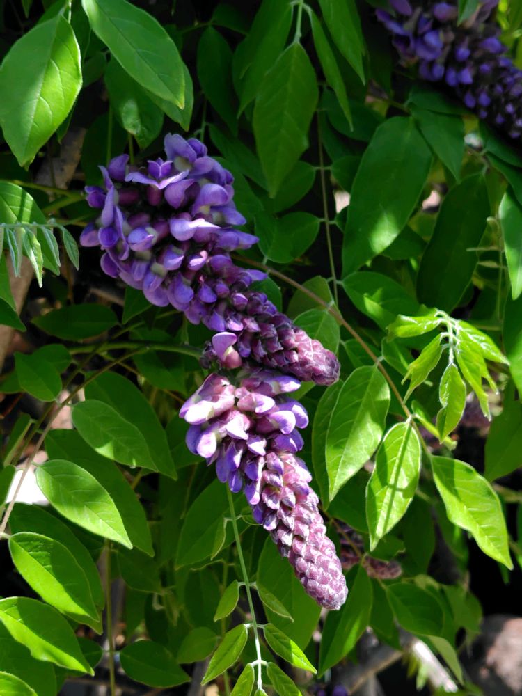 日本のフジに比べて、ツルが短く、花序も垂れ下がらず、ブドウのような房状の花を咲かせる。