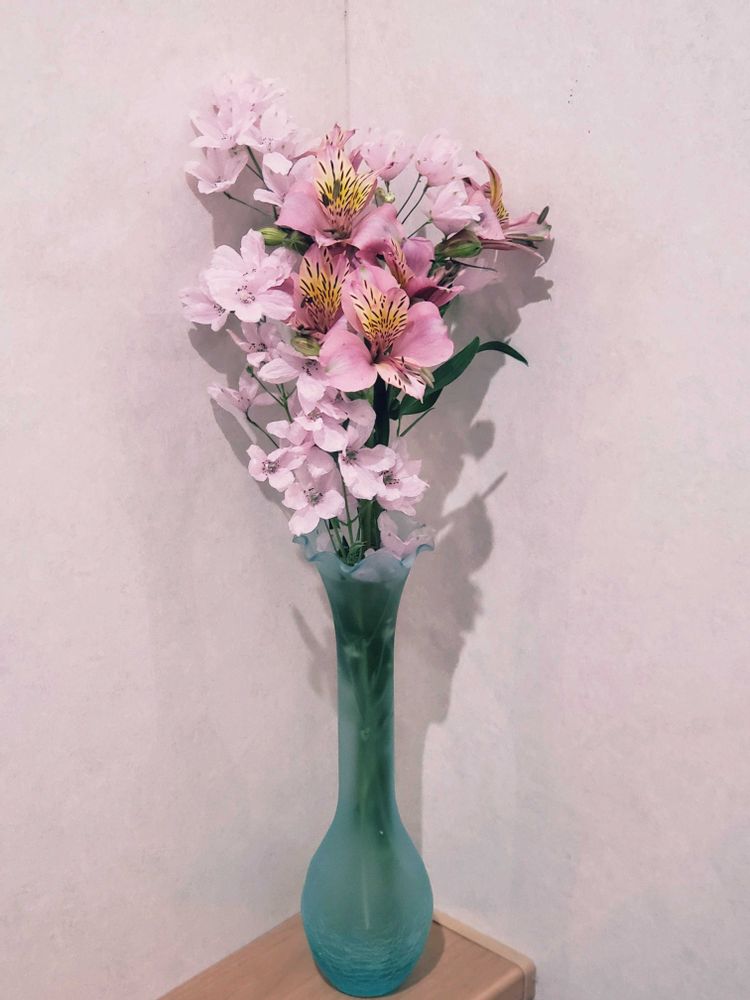 花が散り始めたさくら姫の花茎カットのついでにアルストロメリアも切り花瓶へ。ほぼそのまま入れただけの形