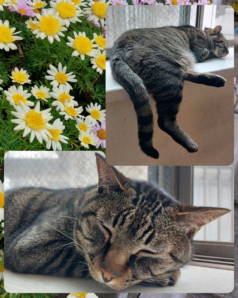 窓辺でお昼寝中のシマ次郎(本名)です。