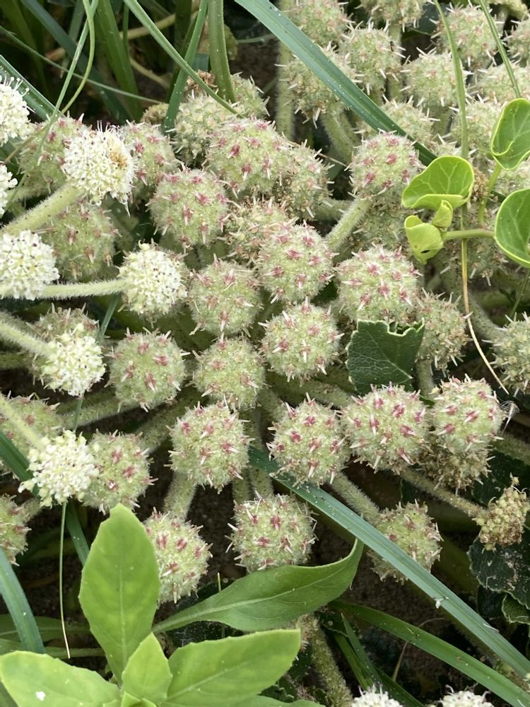 近くの海岸に来ました。予想通りこの花が沢山咲いていました。二枚目は花が終わりタネになりつつある写真です。ゴルフボールのように見えますよねー😊。
