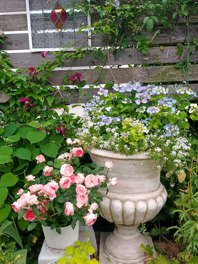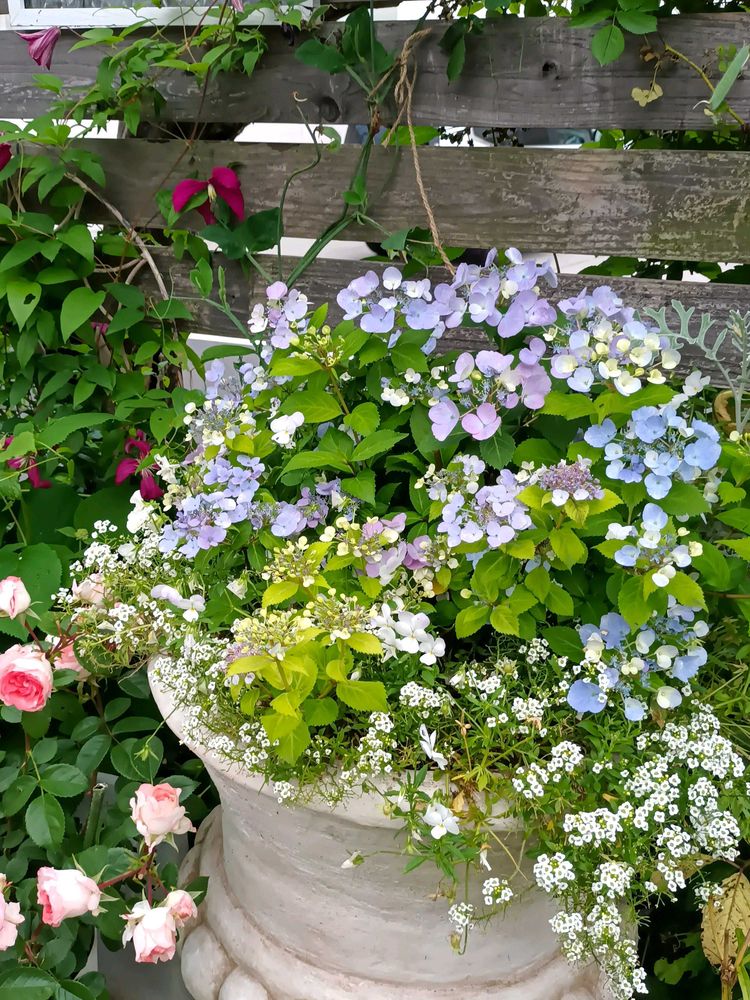 アジサイはラグランジアのクリスタルヴェール、後ろのクレマチスはマダムジュリアコレボンです。
