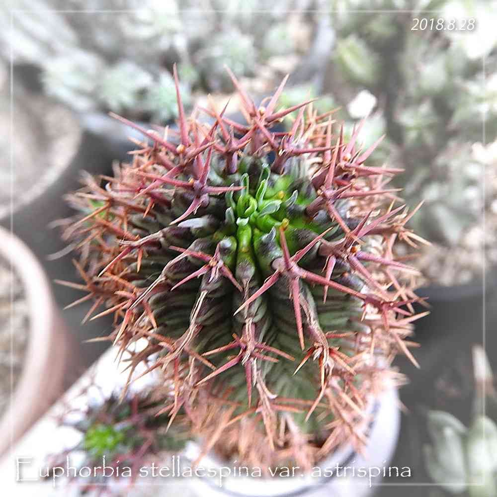 ユーフォルビア、秋星冠を上から。中度1ヶ月前(http://greensnap.jp/post/2772184)は棘でびっしりだった先端に緑の部分が出現。それだけ成長しました。