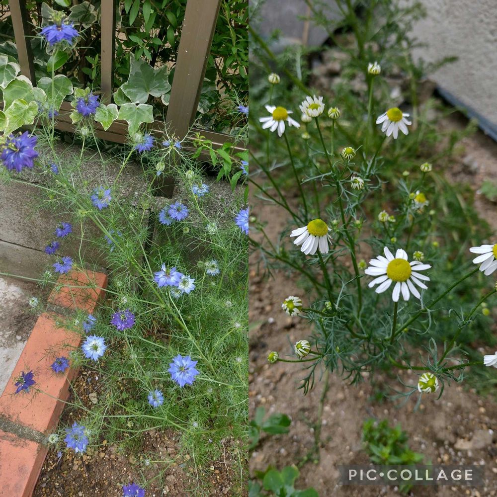 こぼれ種っ子達。ニゲラとカモミール😊💙🤍