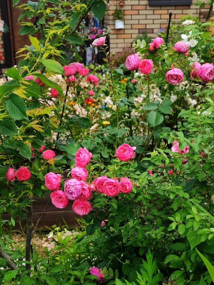本日のバラ。ポンポネッラが見事に咲いてます。アンジェラの血脈らしいですが、それも納得の雰囲気です。アンジェラより花持ちもよく、退色の過程で色幅が出るところも良いです。ちなみにうちのアンジェラはもう1番花が終わり、全部カットしました。