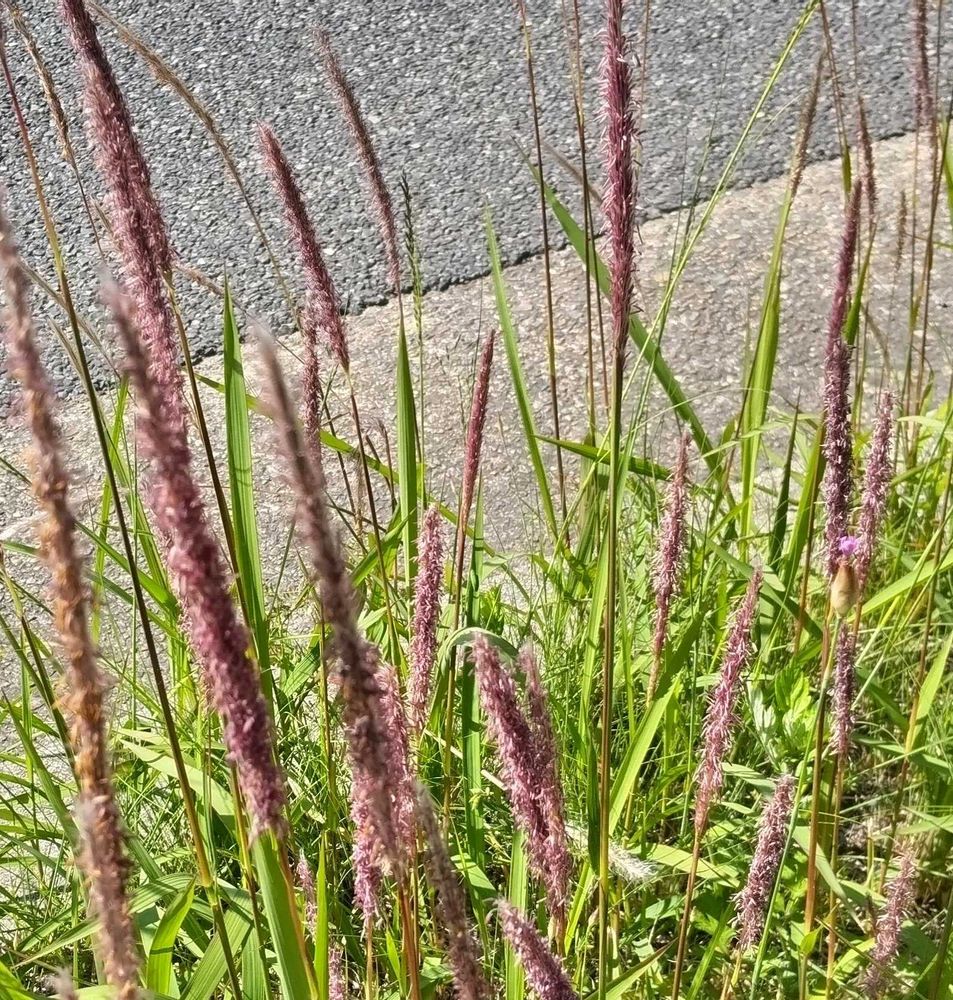 道路に沿った植え込みの中で、群れて生えていて風になびくチガヤ。
