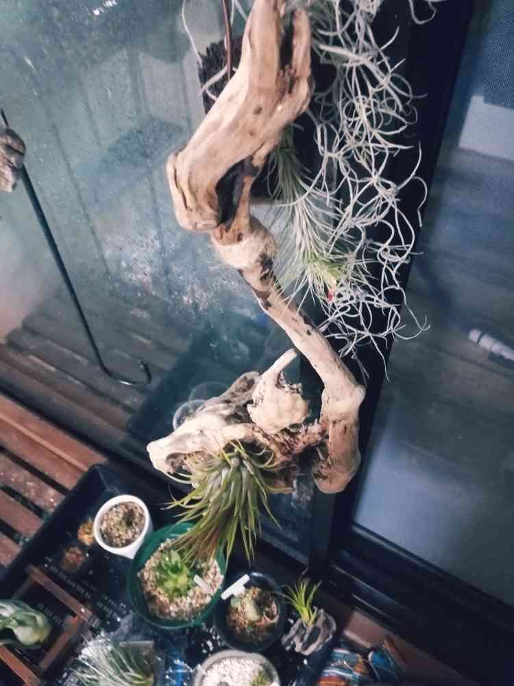 チランジアイオナンタの流木付けに挑戦しました。枯れた根が長かったので、裏でタッカー止めにしました。
