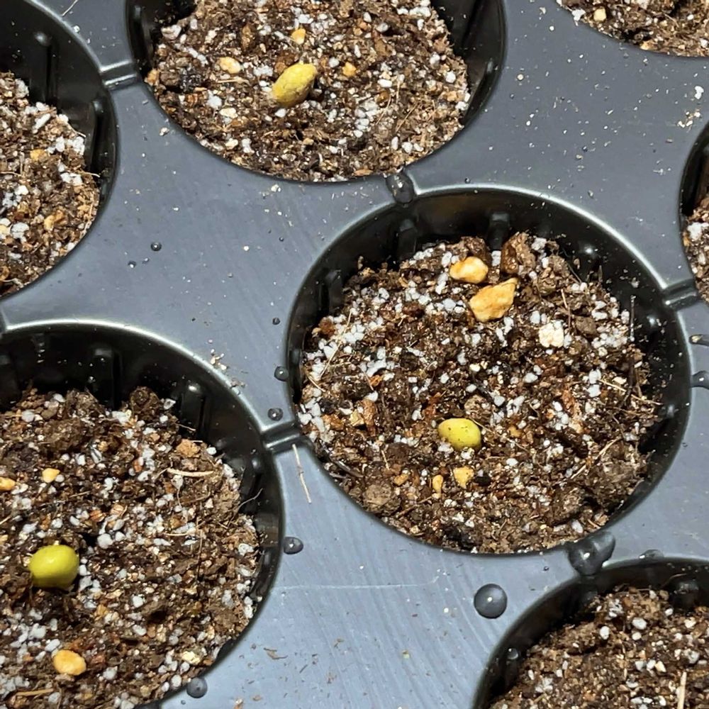 私も初でした🌱1〜1.5cm位のサイズで茶色の表皮を剥くと黄緑の種が出てきました。また定期的に成長記録投稿します😊