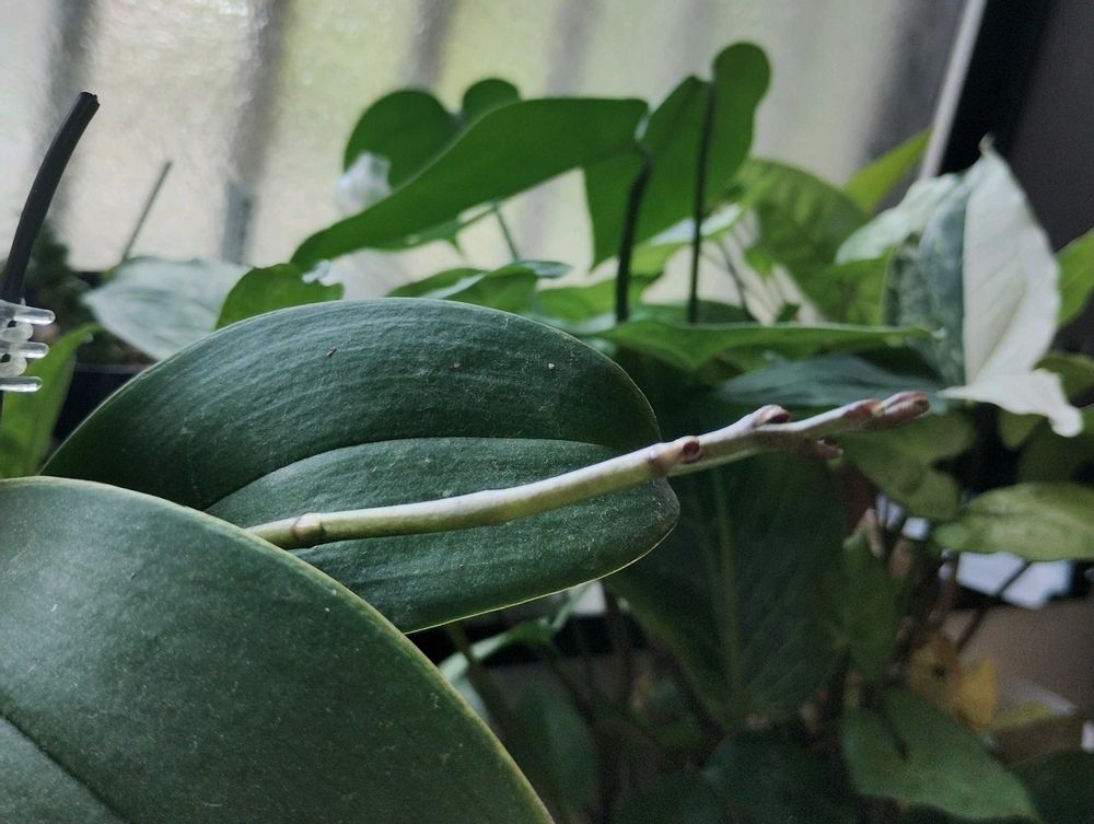 2枚目はマイクロ胡蝶蘭。今朝水遣りしようとしてよく見たら花芽が‼️こんなに伸びるまで気づかないとは😅不思議😱これからはしっかり見ます😊楽しみです(*´艸`)