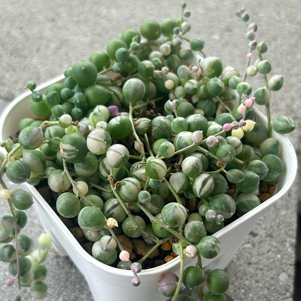 実のようにも見える玉は葉で、水分を貯めています。普通はグリーンネックレスという名前の通り緑ですが、この品種は斑入りなので、そこに白い斑が入り鮮やかです。新芽はピンク色っぽくもなっていますね。