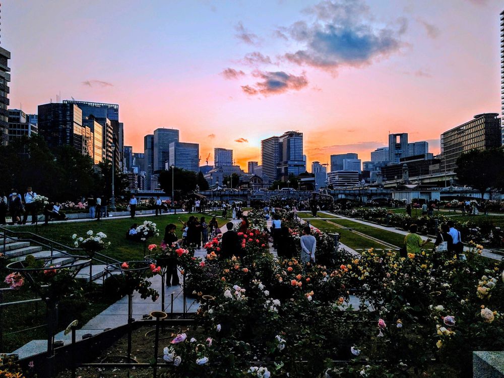 先日の中之島公園のバラ園。夕焼けの景色が撮りたくて•••。