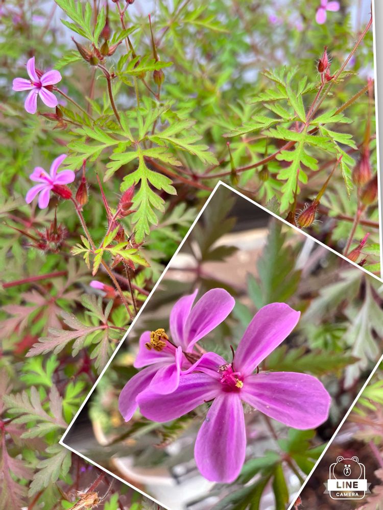 ①のゲラニウム・レッドロビンー以前ご近所で見た姫フウロと花も葉もよく似ているけれど名前が違うなあ、と思ってみていたら別名があったんですね。ピンク色の花びらも黄色の蕊も可愛らしいですね😊