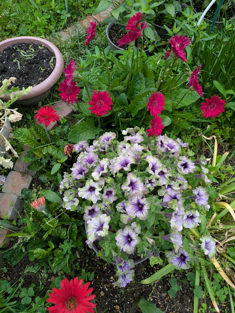 ペチュニアは、鉢植え、地植えのガーベラの隣に置きました。