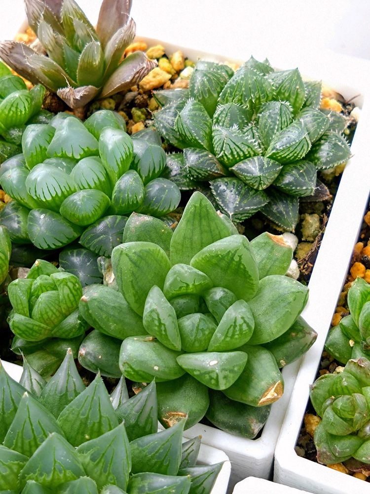 2) 手前:オブツーサ錦(なんとか斑) 中左:ピンクのマリン