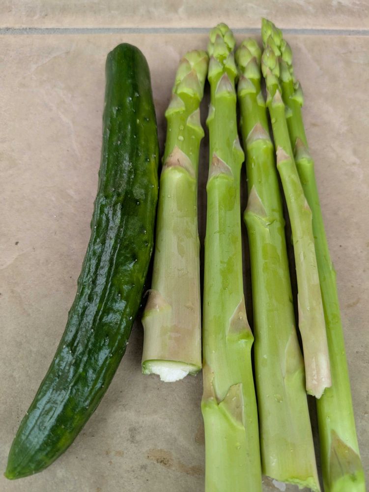 初収穫のきゅうり 早いですね😍うちのは 5cm ぐらいのきゅうりができたばかりです もう少し大きくなったら 摘み取ります アスパラガスが見事ですぅ👏👏👏